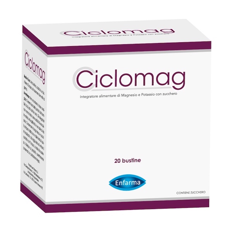 Se hai bisogno di apportare una maggior quantità di magnesio e potassio all’interno del tuo organismo, scegli Ciclomag: un integratore alimentare altamente efficace, utile a contrastare i sintomi derivanti dalla mancanza dei due minerali quali stanchezza, astenia, irritabilità, nervosismo, debolezza muscolare e crampi. Soprattutto prima e durante il ciclo mestruale può rivelarsi un valido aiuto per passare al meglio le giornate, evitando che il malessere fisico incida sulla normale routine quotidiana.