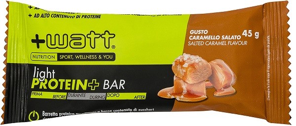 +Watt Light Protein+ Bar Caramello Salato è una barretta proteica multistrato pensata per chi cerca uno snack pratico e bilanciato, utile sia nello sport che nei regimi alimentari a basso contenuto di zuccheri e ricchi di proteine. Grazie all’elevata presenza di proteine del latte e proteine di soia isolate, questa barretta sostiene la massa muscolare e contribuisce a una prolungata sensazione di sazietà. La ricopertura di cioccolato fondente con edulcorante rende ogni morso gustoso ma leggero, mentre la presenza di fibre favorisce un corretto apporto nutrizionale. L’apporto ridotto di zuccheri e la ricchezza in polioli (maltitolo, sorbitolo, sucralosio) permettono di inserirla anche in diete a bassissimo indice glicemico. Grazie a una formulazione senza glutine dichiarato, e all’assenza di grassi idrogenati, la barretta è adatta come supporto nell’alimentazione sportiva o quotidiana, fornendo circa 14 g di proteine per porzione. Adatta a chi segue una dieta iperproteica e cerca un prodotto pratico e dal gusto coinvolgente.