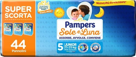 Pampers Sole e Luna Trio Junior è un pannolino monouso specificamente studiato per bambini di peso compreso tra 11 e 25 kg. Grazie alla sua struttura interna con polpa di cellulosa e poliacrilato di sodio superassorbente, garantisce un elevato potere assorbente per offrire al bambino asciutto e comfort a lungo, anche durante la notte. Il tessuto esterno traspirante e le chiusure elastiche laterali assicurano una perfetta aderenza e grande libertà di movimento senza irritare la pelle delicata dei più piccoli. Dermatologicamente testato, senza profumazioni o lozioni aggiunte, è privo di ingredienti di origine animale, lattice naturale, glutine e lattosio, assicurando così una scelta sicura per i bambini sensibili e con particolari esigenze. Pampers Sole e Luna Trio Junior si inserisce nella routine quotidiana di igiene garantendo assorbenza, protezione e praticità, rappresentando la soluzione ideale per i genitori alla ricerca di affidabilità e delicatezza.