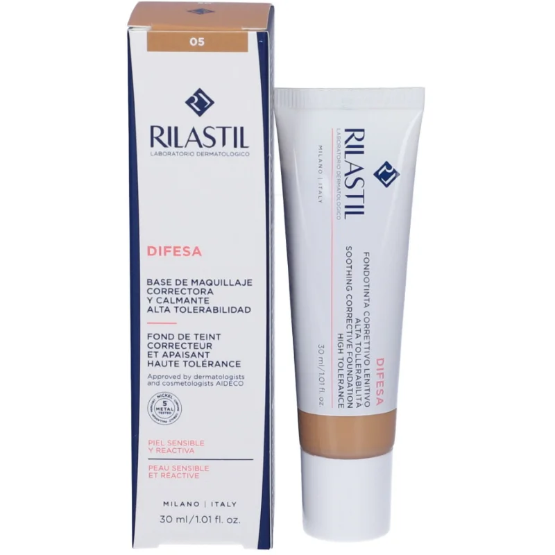 Rilastil Fondotinta Correttivo Lenitivo 05 è un fondotinta fluido specifico per pelli sensibili, reattive e intolleranti, progettato per uniformare l’incarnato, minimizzare discromie, rossori, acne, couperose e altre imperfezioni cutanee. Grazie alla sua texture leggera e coprente, dona un aspetto naturale senza occludere i pori, risultando ideale anche per l’impiego quotidiano. La formulazione contiene principi lenitivi come l’allantoina, la vitamina E (Tocopheryl Acetate) e il bisabololo, che contribuiscono ad attenuare le irritazioni e rinforzare la barriera cutanea, mentre la presenza di pigmenti minerali assicura un’elevata coprenza senza effetto maschera. Nickel tested, dermatologicamente testato su pelli sensibili, non comedogenico e privo di parabeni o derivati del grano, risulta adatto a soggetti con intolleranze e allergie. Disponibile nella tonalità 05, ideale per incarnati scuri o abbronzati, regala una pelle uniforme e protetta dagli agenti esterni, offrendo al tempo stesso comfort e tollerabilità.