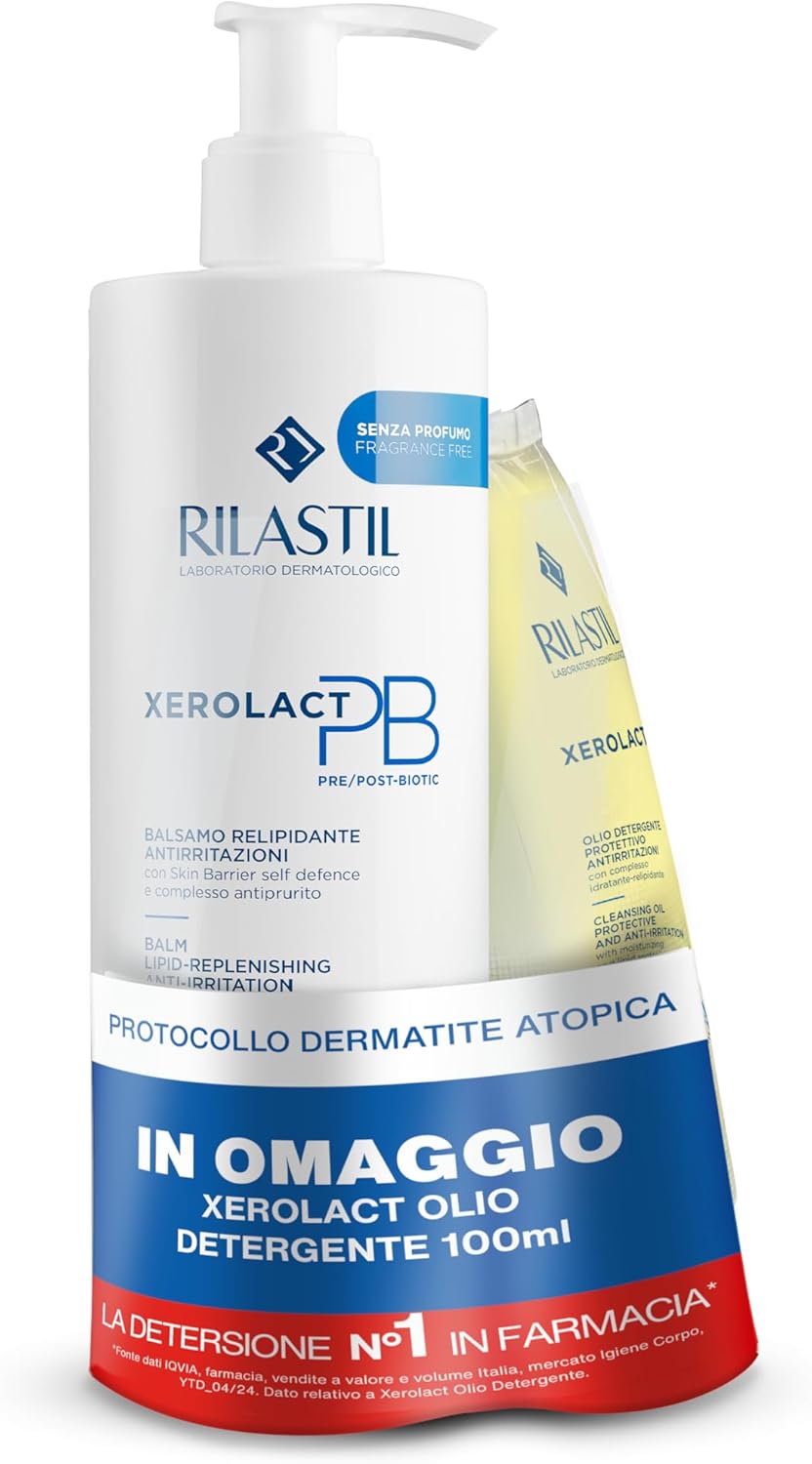 Rilastil Xerolact PB Balsamo + Olio è un trattamento dermocosmetico completo, studiato per le esigenze della pelle secca, molto secca, irritata o soggetta a prurito, sia negli adulti che nei bambini. Il balsamo, caratterizzato da una texture ricca e cremosa, offre un’idratazione intensa e prolungata, utile per ripristinare la barriera cutanea compromessa dagli agenti esterni e alleviare la sensazione di fastidio e prurito. L’olio, ricco di ingredienti emollienti e lenitivi come l’olio di enotera e l’olio di mandorle dolci, favorisce il ripristino del film idrolipidico e la morbidezza della pelle, senza lasciare residui grassi.